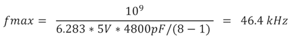 假设可用的恒流源是可调的,可提供 8mA 的恒定电流。对于这 8mA,假设 1mA 是设备无失真的工作所需的, 高达7mA可用于驱动线缆固有的容性负载。例如,假设使用的同轴线缆长度为150英尺,典型的线缆电容为32pF/ 英尺,因此总电容约为 4800pF。缩放系数 109用于单位换算。IEPE 加速度传感器或 RCC 的输出信号是 5Vpk, 那么不受电流限制可传输的以 Hz 为单位的最高频率(-3dB)为: